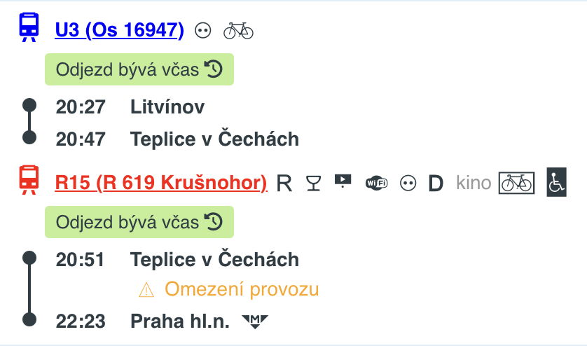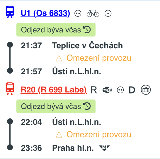 V případě zpoždění prvního vlaku a kdyby druhý vlak ujel, je možné z Teplic jet dále následujícím spojem. Upozorňujeme, že pokud budete mít zakoupenou jízdenku s povinným vlakem R619 (což doporučujeme, kvůli její nízké ceně) a osobák bude mít zpoždění menší než 30 minut, budete muset doplatit rozdíl oproti klasické jízdence. K tomu doporučujeme využít pokladny na nádraží, ve vlaku by vám účtovali další přirážku. Pokud bude mít zpoždění větší, můžete využít jízdenku bez jakýchkoli příplatků.